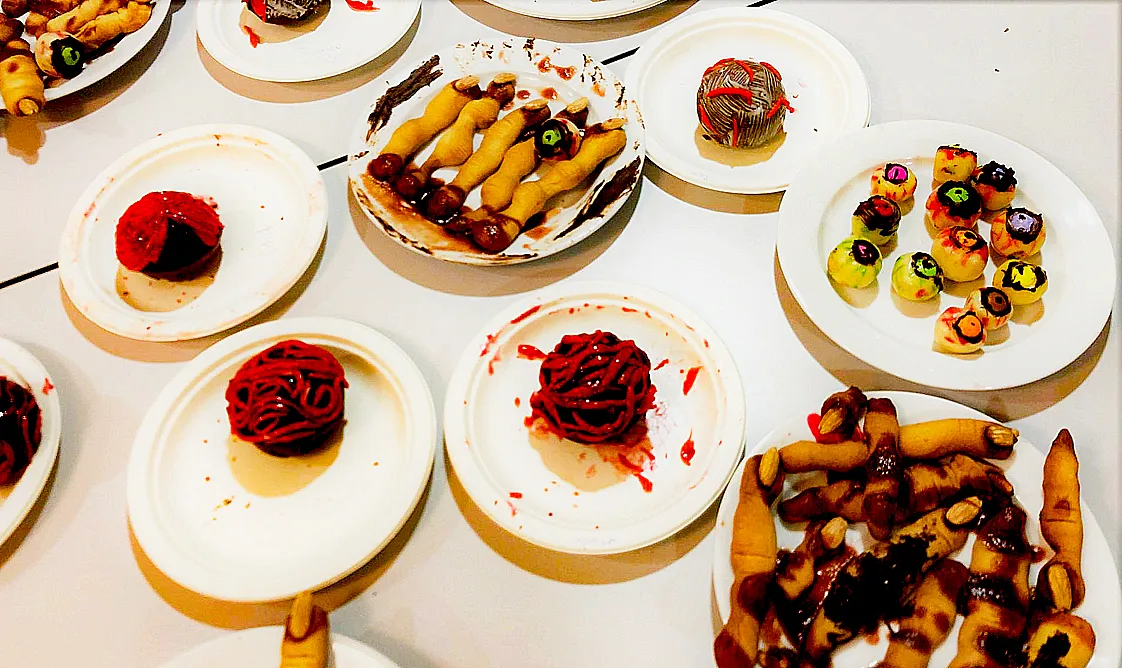 La cuisine de l'horreur : les jeunes ont pâtissé pour le goûter d'Halloween, au menu : cerveaux, des yeux, des doigts coupés... Bon appétit ! (DR)