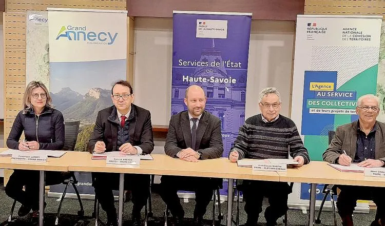 La signature de la convention cadre pour lancer la phase opérationnelle a eu lieu ce jeudi 18 janvier 2024, dans les locaux de l’agglomération du Grand Annecy par Mr le Préfet, Yves Le Breton, Frédérique Lardet, présidente du Grand Annecy, Jean-Claude Martin, Maire d’Alby-sur-Chéran, Christian Anselme, Maire de Fillière et Henri Chaumontet, Maire de Groisy, dans le cadre d’une démarche partenariale.