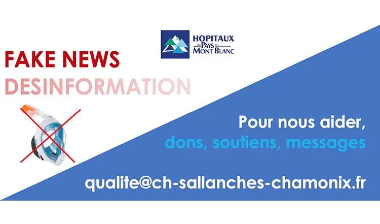 Les Hôpitaux du Pays du Mont Blanc attirent votre attention sur une fake news qui circule actuellement concernant des besoins éventuels de masques Décathlon pour un projet « respirateur Hôpital Sallanches ». Il s’agit d’une initiative individuelle non vérifiée, ni validée.