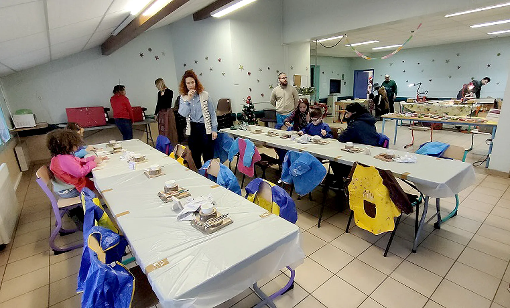 Dans le réfectoire, un atelier bois était proposé aux enfants par un papa menuisier. Les petits pouvaient dessiner un magnifique bougeoir sur du bois de tilleul avec un gabarit, le découper et le peindre. Ils pouvaient aussi décorer un petit rondin afin de réaliser une décoration pour le sapin.