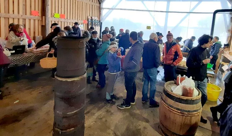 On vendait du boudin, de la compote de pommes pour l'accompagner, des tomes blanches, du jus de pommes, des tripes, des courges, de la soupe. Et bien sûr il était possible de trinquer avec les amis rencontrés.