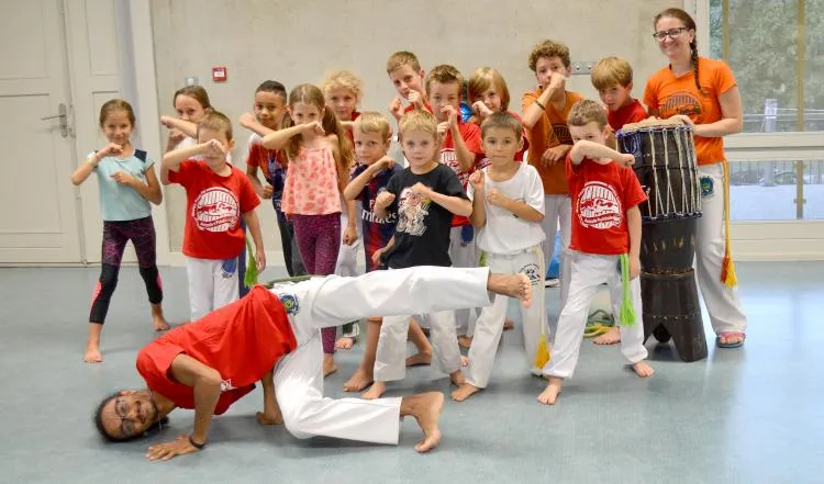 Dans une ambiance brésilienne rythmée par le pandeiro (tambourin) ou l'atabaque (djembé), les apprentis "capoeiristes" balancent élégamment leurs épaules, leurs bras en effectuant des pas d'attaque ou d'esquive.