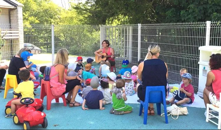 Pour clore chaque séance, l’éducatrice de la crèche réunissait, au son de sa guitare, tous les enfants autour de comptines enfantines.