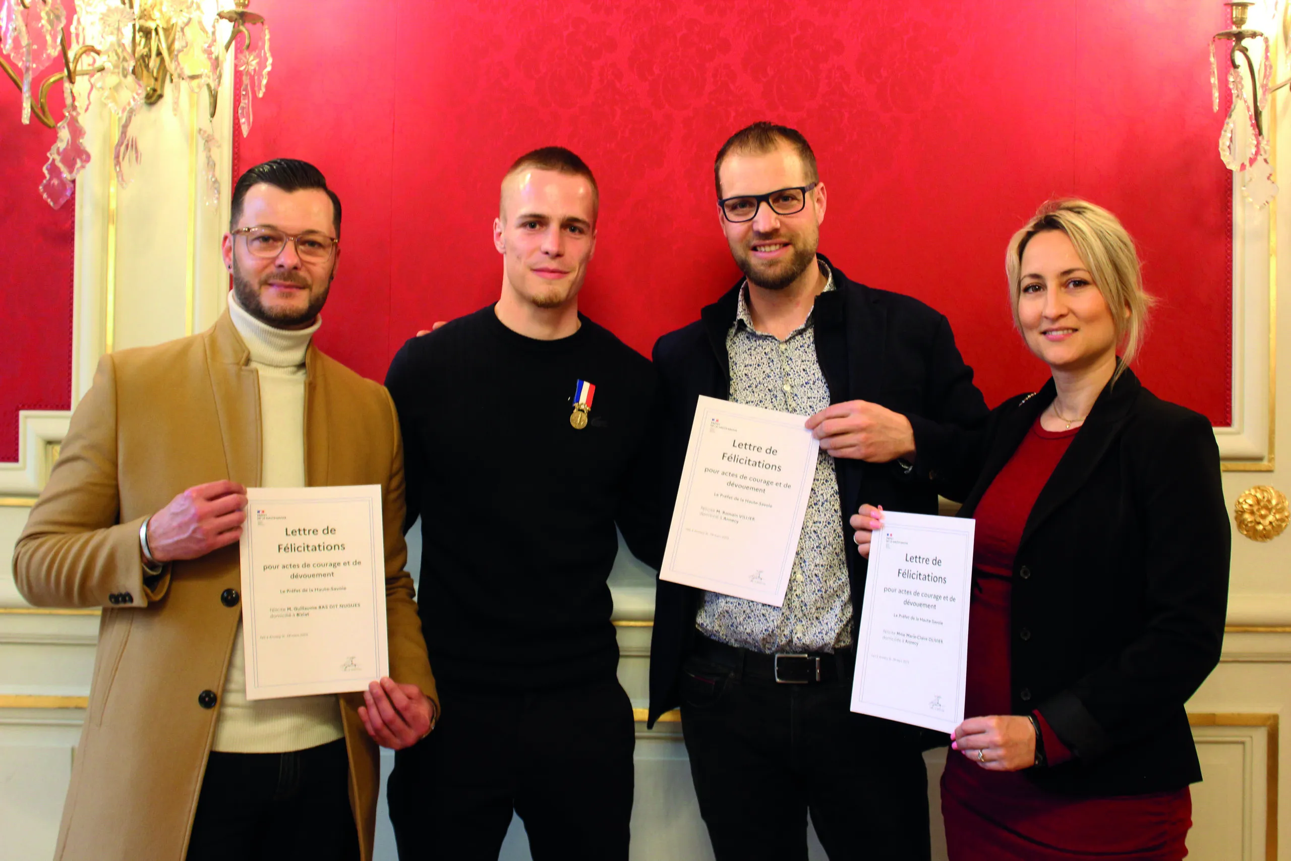 Dans le salon Péries de l’hôtel de préfecture à Annecy, le préfet a tenu à témoigner son admiration envers ces citoyens, héros d’un jour, qui ont fait preuve de sang-froid pour tenter de sauver des vies : «C’est une cérémonie un peu particulière, car j’ai l’habitude de remettre ces médailles à des membres des forces de l’ordre, des pompiers ou de la Protection Civile. Aujourd’hui ce sont des civils qui sont récompensés, des gens dont ce n’est pas le métier de porter secours à leurs concitoyens et c’est d’autant plus remarquable».
