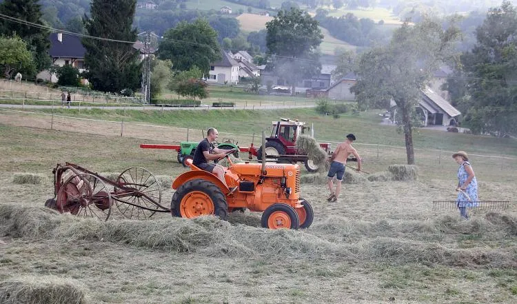Les jeunes agriculteurs de la commune qui se sont investis dans ce projet ont pu utiliser tout le matériel qu'ils avaient amené sur place. Avec quelques vieux tracteurs, ils ont fauché, passer la faneuse. Puis ils ont pu faire les andains avec un «andaineur» trouvé au fond d'une grange, et botteler pour enfin charger à la fourche, les bottes, (carrées comme avant» sur les remorques... un peu plus modernes... Les épouses de ces jeunes «paysans» ont aussi mis la main à la pâte, enfin plutôt au râteau, puisqu'elles l'ont tiré au fur et à mesure du travail de leurs compagnons.