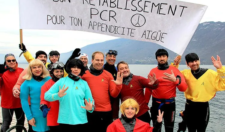 Tels des acteurs respectant leurs scénarios à la lettre, les plongeurs participant à la traditionnelle plongée de l'an neuf à Aix-les-Bains se sont glissés dans la peau de personnages de séries télévisées et ont pour certains assuré l'ambiance en musique avant de se mettre à l'eau dans un lac du Bourget dont la température avoisinait dimanche après-midi les 7°C. Pendant qu'ils enfilaient leur matériel habituel sur l'Esplanade du lac à proximité du ponton des pêcheurs, à savoir combinaison, masque, détendeur, bouteilles et palmes, et le recouvrait pour la plupart de costumes et accessoires choisis pour l'occasion, les passants se réchauffaient quant à eux avec des boissons chaudes et des crêpes servis par les bénévoles du comité départemental de plongée de la Savoie. Au total une trentaine d'hommes et de femmes grenouilles se sont mouillés de la tête aux pieds lors de cet événement.