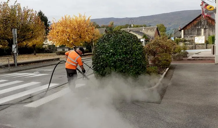 Le désherbage à la vapeur est assuré par une société privée basée à Hauteville-sur-Fier, Alpes Désherbage. Pour cette année, il a été effectué au chef-lieu, autour des bâtiments école du Centre, église et mairie ; il a fallu six interventions, pas moins, pour réaliser un désherbage efficace sur le parking communal et les bordures des trottoirs.