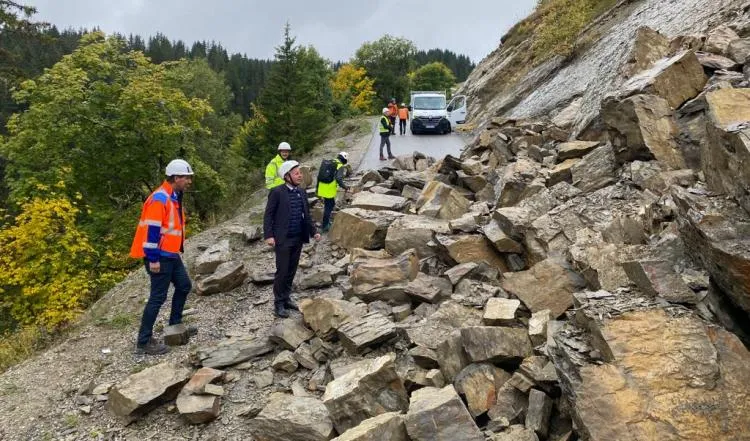 Ce jeudi 29 septembre, entre 5h30 et 6h30 du matin, un éboulement rocheux est survenu sur la RD 55b à Glières-Val-de-Borne. Cet incident a engendré la fermeture totale de la route dans les deux sens de circulation. Martial Saddier, Président du Conseil départemental de la Haute-Savoie et Lionel Tardy, Vice-président délégué aux routes, aux bâtiments, aux pistes cyclables et aux mobilités, se sont rendus sur place ce jour. Le glissement de terrain du versant en amont, survenu sur le territoire de la commune de Glières-Val-de-Borne, a été provoqué par les fortes pluies de ces derniers jours. La commission de sécurité s’est réunie ce jour pour faire un point sur les aléas résiduels et convenir de la suite à apporter à la zone impactée par cet événement. Les travaux envisagés consistent en la sécurisation du site par ancrages, prévue sur plusieurs jours, puis le déblaiement de la route. Les matériaux écroulés représentent un volume d'environ 20ml de large par 25ml de haut et entre 1,50 mètre à 2 mètres de profondeur, soit un volume en place de l'ordre de 800m3. Le volume foisonné à évacuer est estimé à près de 1000m3. Les travaux vont durer au minimum quinze jours. Par ailleurs, les travaux de sécurisation de la RD 55 côté Fillière ont été interrompus dès ce matin. La route a été mise en sécurité pour permettre une réouverture à la circulation dès 12h. Ces travaux programmés sont suspendus jusqu'à nouvel ordre.
