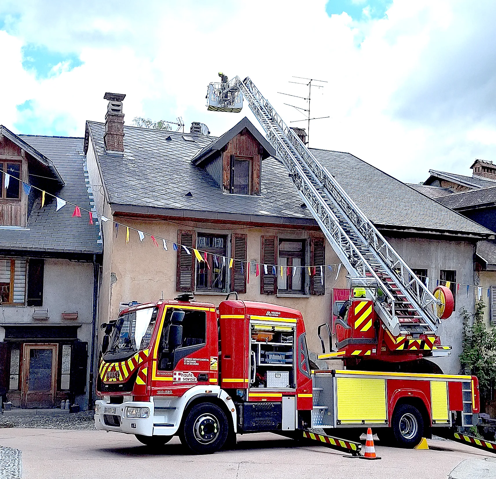 Sur la place du Trophée, au centre du vieux bourg d’Alby, la grande échelle est déployée. On peut constater le déploiement exceptionnel du dernier bras qui peut se mettre à l’horizontal, et qui peut également basculer de l’autre côté du bâtiment.