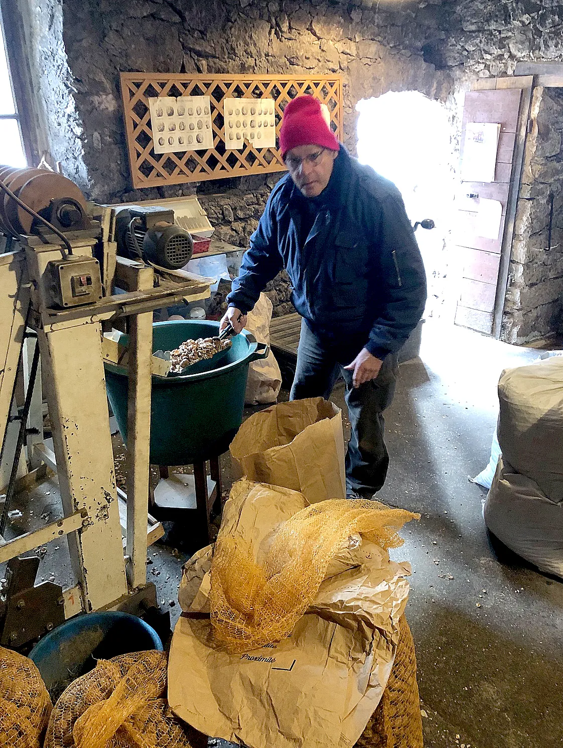 Jean-Pierre Michaud récupère les noix cassées au moulin d’Arith.