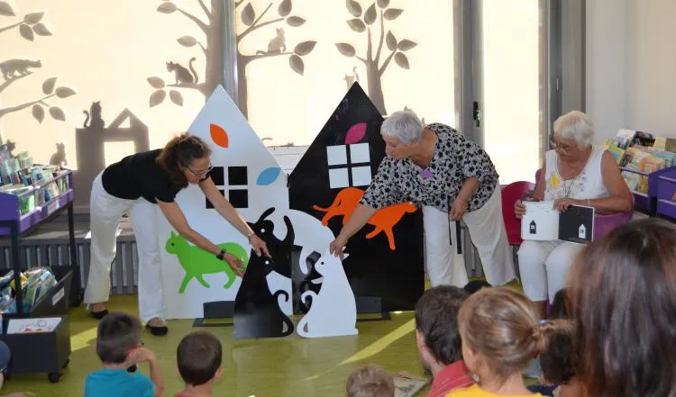 Comptines et jeux de doigt, lecture, chansons enfantines un vrai succès ! Les enfants pouvaient même retrouver le livre dans la cabane montée pour l'occasion à l'extérieur de la bibliothèque et faire un coucou-caché derrière les portraits de chats !