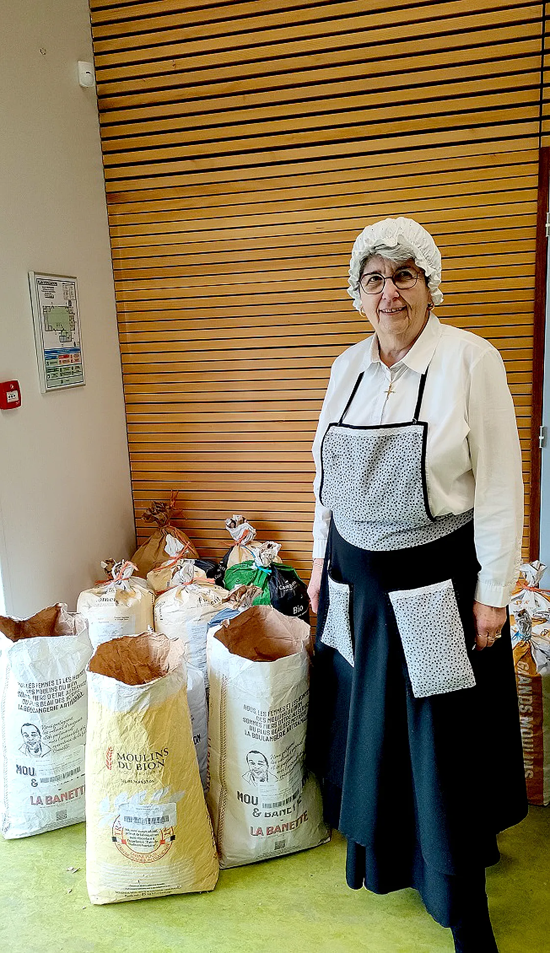La présidente Mme Catherine Orset présente les sacs de noix après le tri.