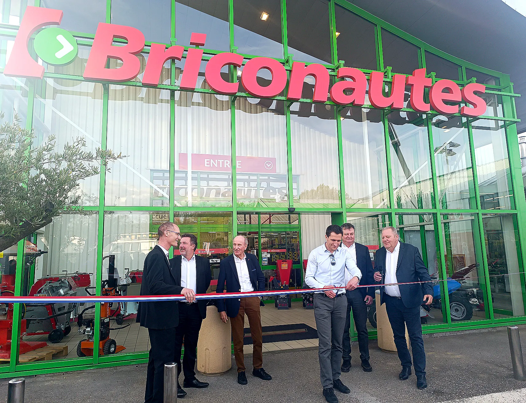 Coupé du ruban par le maire de Sales Yohann Tranchant, aux côtés du fondateur du groupe Chavanel, des deux dirigeants, du directeur du magasin Briconautes et du PDG du Club des Briconautes.