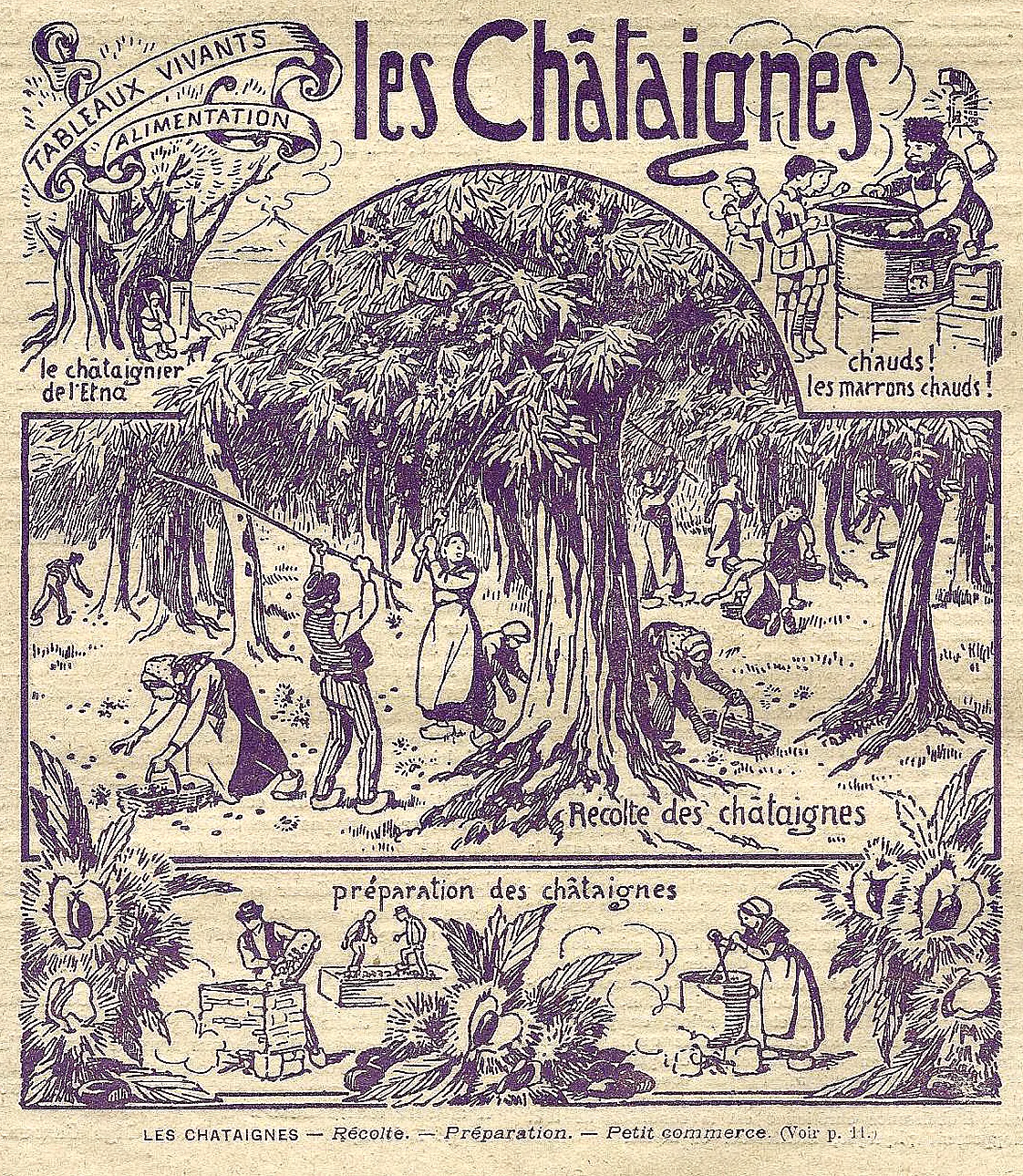 La fréquentation des textes anciens du XVIIIème siècle ou de l’époque Sarde nous fait souvent croiser le châtaigner et son fruit merveilleux. A une époque où la culture de la pomme de terre s’installe lentement, la châtaigne reste encore indispensable à la subsistance du petit peuple. Mais ce n’était pas la seule ressource qu’apportait la castanéiculture, le châtaigner étant aussi précieux pour son bois et même pour son écorce dont on tirait du tanin. Ainsi, à l’époque de Jean-Jacques Rousseau, de belles forêts de châtaigniers couvraient les pentes des collines de l’Albanais et de toute la Savoie. «Le châtaignier» écrit en 1807 le préfet De Verneilh «cet arbre précieux qui nourrit et chauffe l’homme en même temps qu’il lui est d’un si grand secours pour la charpente et la menuiserie, réussit très-bien dans les vallées inférieures ; plusieurs collines en sont couvertes dans les arrondissements de Chambéry et d’Annecy».