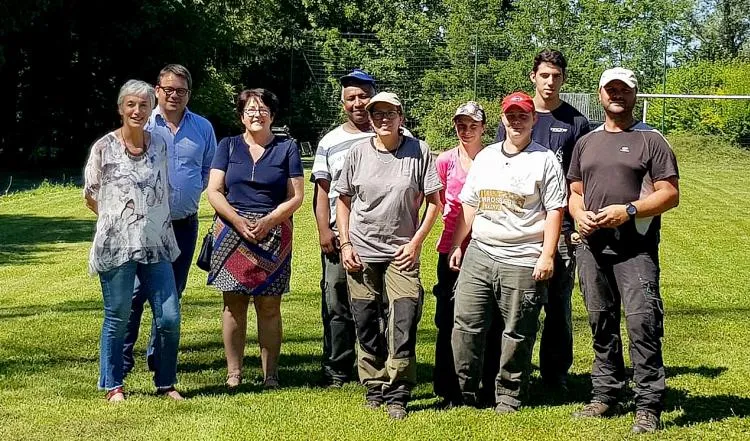 Cette semaine passée, l'équipe du Chantier Local d'Insertion était présente dans la commune pour tondre le stade Bogey. Profitant de leur intervention dans le village, les salariés ont pu faire la connaissance des nouveaux élus : la nouvelle maire Patricia Mermoz et son adjoint aux travaux Fabien Georges. L'équipe a aussi par la même occasion, rencontré les encadrants Mickaël et Virginie, ainsi que Fabienne Duliège, conseillère départementale et adjointe au maire de Saint-Félix, conseillère déléguée au Grand Annecy, chargée du Chantier local d'insertion.