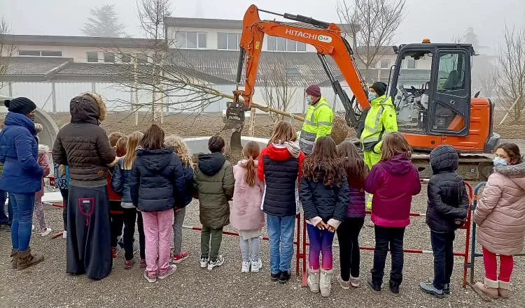 C’est dans ce cadre que les élèves de CE2–CM1 ont pu participer à la plantation des arbres qui orneront la cour de la future école maternelle. Ce projet s’est déroulé en deux temps. Une première étape théorique a été réalisée avec l’enseignante : travaux sur la vie de l’arbre, choix des essences, étapes de la mise en terre, compréhension des ombres… Puis les enfants ont assisté à la pose des arbres par l’entreprise paysagiste retenue. Ils ont pu poser toutes leurs questions au paysagiste présent sur place afin de faire de ce temps une véritable illustration des connaissances acquises en classe.
