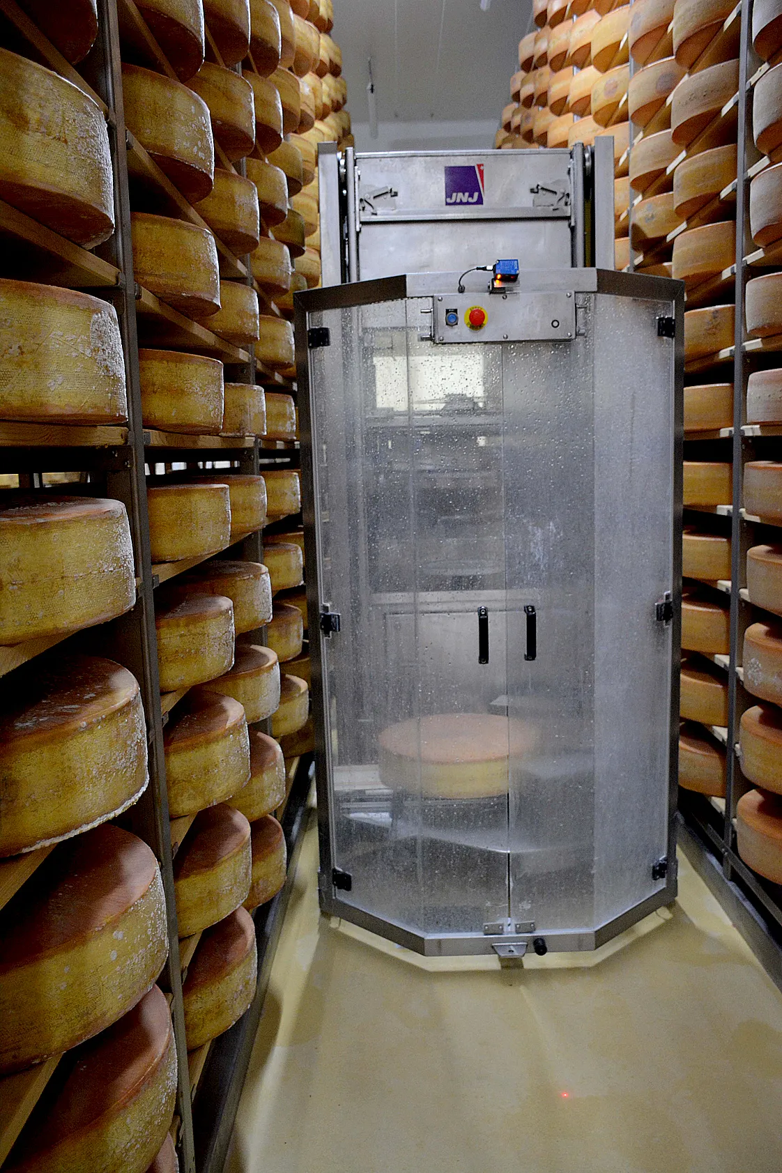 La cave d’affinage du fromage «Cœur de Savoie», un robot lave et retourne les meules.