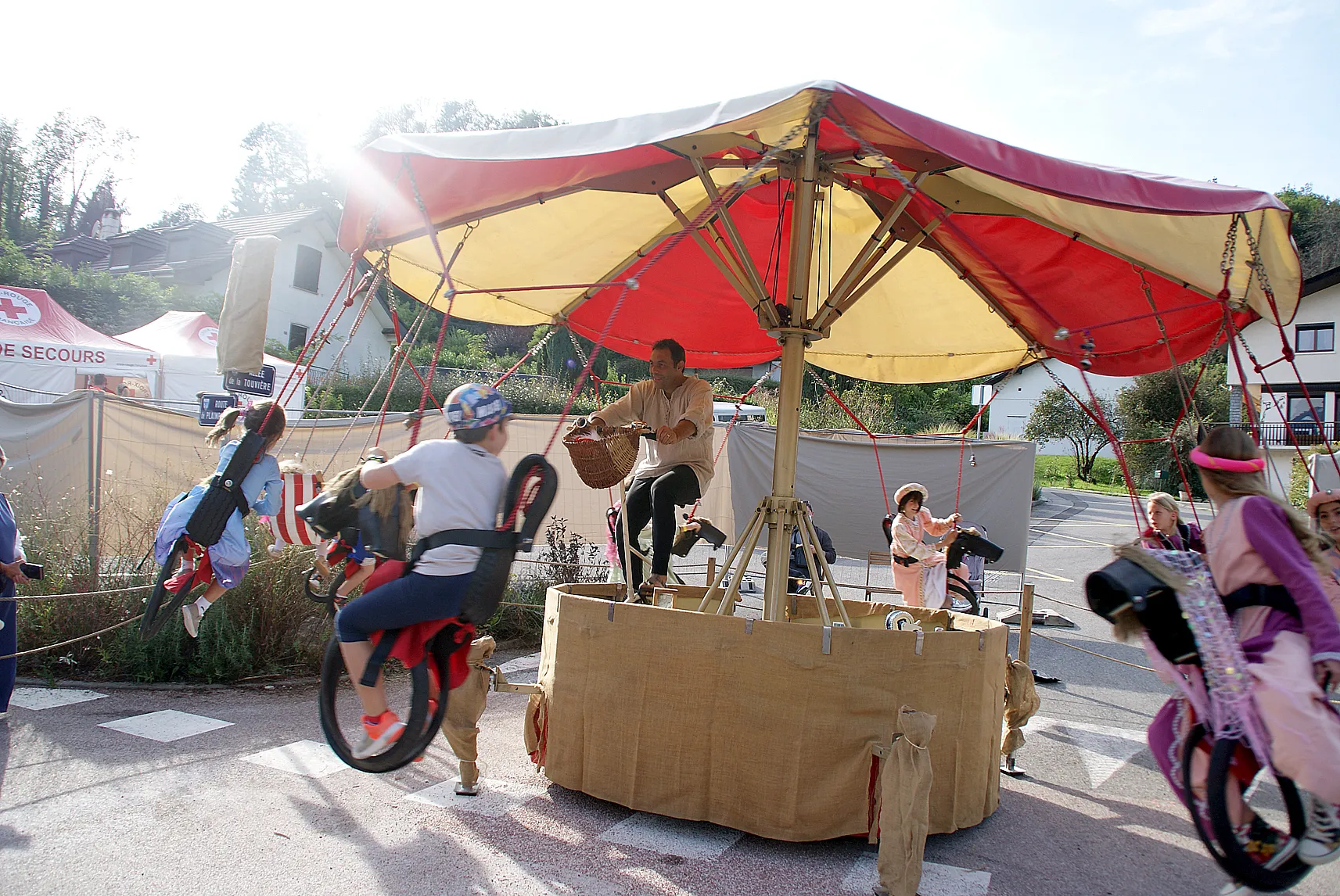 Un manège, copie d'un modèle d'époque du Moyen-Age, tournait à la force des jambes de son constructeur, et fabriqué à partir de matériaux recyclés, tels que des pneus...