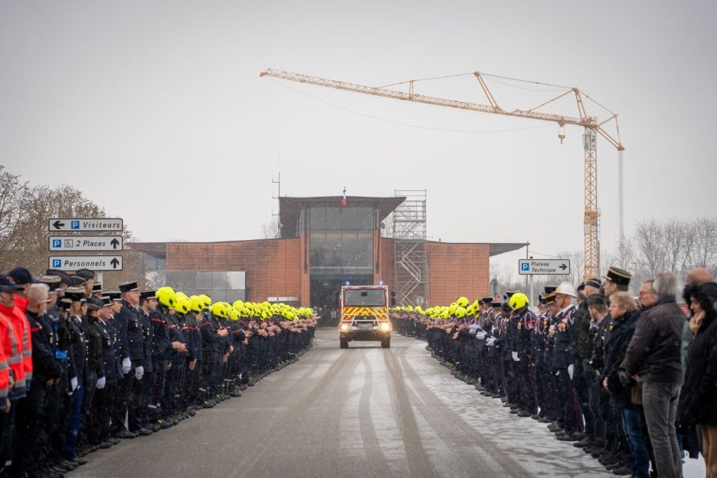 Moment particulièrement fort de la cérémonie, le lieutenant Jordhan Harvey a pris symboliquement son dernier départ en intervention, quittant la caserne par la grande porte, encadré par deux camions-citernes feux de forêt. Sous la neige, une haie d’honneur a accompagné le cortège funèbre jusqu’au portail du centre, dans un silence empreint de respect et d’émotion.