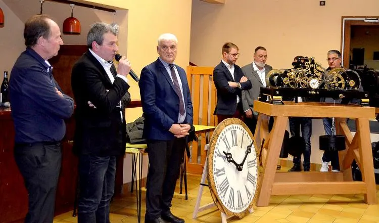 Dans un coin de la salle une table drapée intriguait l’assemblée. C’est seulement à l’issue de son allocution que Joël Mugnier, maire a dévoilé ce qui se cachait dessous : l’ancienne horloge du clocher de l’église complètement rénovée.