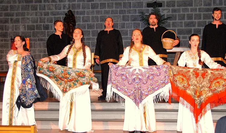 Au programme : des chœurs orthodoxes et des extraits du mariage russe ancien avec "les canards volent, l’herbe foulée, lamentation de la fiancée, le liseron au dessus de l’eau"... des interprétations chantées en mouvement avec des choristes qui échangent, papotent, s’interpellent sous la direction de Yulia Khutoretskaya, conseillère artistique de la fête de la fédération de Russie.