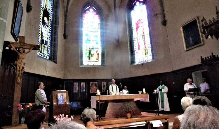 La messe du 28 août n’a pas eu lieu en plein air au Mont-Clergeon cette année, cause sècheresse, mais a été célébrée à l’église de Ruffieux, rassemblant les paroissiens des deux vallées, comprenant les paroisses Sainte Marie en Chautagne et Notre Dame de l’Aumône.