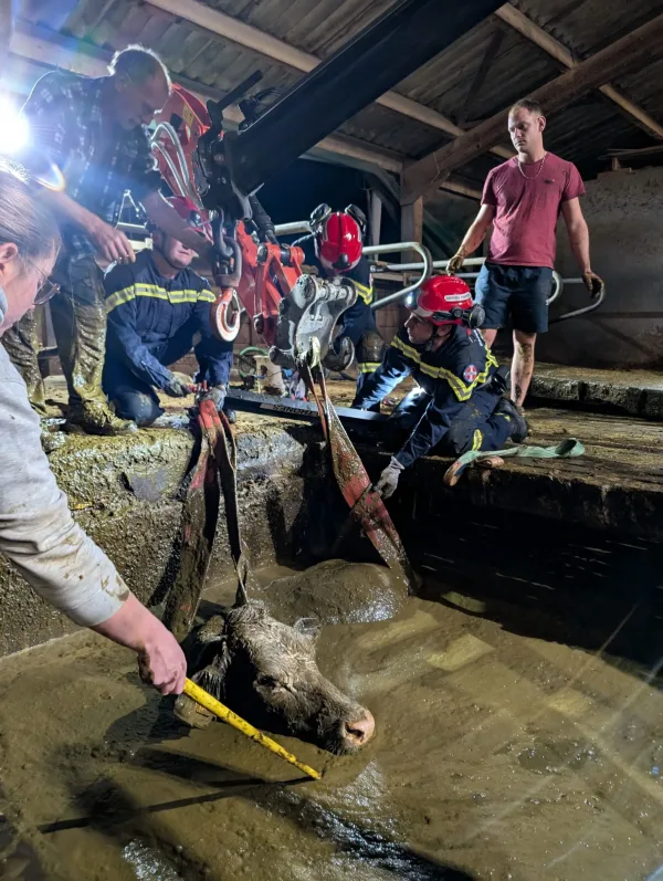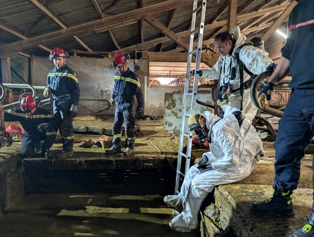 Deux sapeurs-pompiers, équipés de combinaisons étanches de type risque chimique et d’appareils respiratoires isolants, se sont immergés dans la fosse. Leur mission : glisser les sangles sous les vaches épuisées, afin de permettre à un engin de levage privé de procéder aux sorties, une par une. Une manœuvre de longue haleine, rendue possible grâce aux conseils d’un spécialiste du risque animalier.