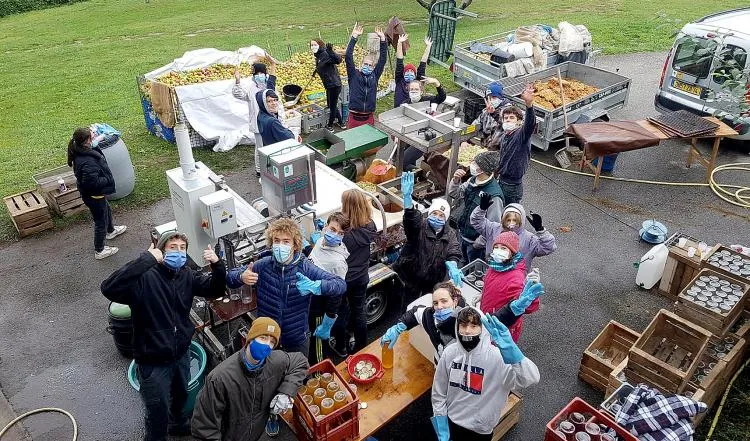 22 jeunes se sont affairés tour à tour, pour ramasser, trier, laver toutes ces pommes. Ils les ont broyées, mis dans le pressoir pour sortir le jus qui a ensuite été stérilisé, et finalement mis en bouteille.