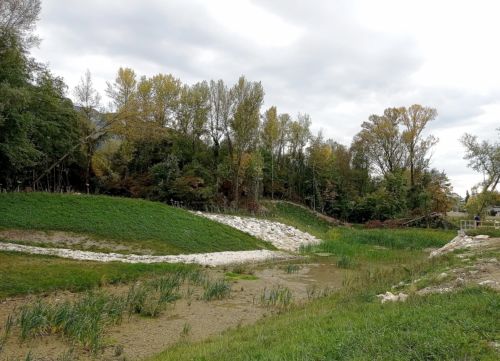 Ce bassin de rétention a été crée sous la maîtrise d’ouvrage du Cisalb, entre septembre et décembre 2020. 17 000 m3 qui, à travers le stockage de 80% du volume de la crue centennale, vont permettre de diviser par 5 le débit de la rivière à l’entrée d’Aix-les-Bains. Deux autres bassins prévus durant la durée du mandat, dont un l’année prochaine aux Garins, devraient constituer une capacité totale de 50 000 m3 de stockage. En temps normal, les eaux du Combo capturées dans le bassin permettent un écoulement maîtrisé dans le lit naturel du ruisseau qui le contourne.  En cas de fortes pluies, le surplus du débit est dévié dans le bassin qui se remplit et stocke l’eau. Lorsque le calme revient, l’écoulement du cours d’eau diminue et la vidange du bassin commence : celui-ci se vide en attendant la prochaine crue. Un déversoir de sécurité a été créé, en cas de dépassement de la capacité de stockage du bassin, afin de permettre au trop-plein d’être évacué sans endommager ni détruire la digue.