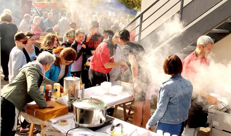 De bonne heure aussi, on s’affairait à la fabrication du cidre pour satisfaire tous les amateurs, et il y en eu pléthore, pendant que s’installaient les producteurs locaux et il y avait le choix. Des légumes au chocolat en passant par les fromages ou la charcuterie chacun pouvait trouver son plaisir. Pour les gourmands les tartes, Saint-Genix, pains regorgeaient et les amateurs de pommes pouvaient trouver à échanger avec l'association "Croëzons et Carmaniules". Dans les coulisses se concoctait le menu du jour pour satisfaire les papilles de ceux qui faisaient le choix de le déguster sur place.