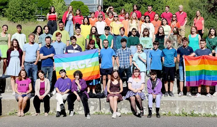 Du 16 au 20 mai, c'était la Rainbow'eek au lycée de l'Albanais : une semaine pour lutter contre les discriminations liées aux identités de genre et à l'orientation sexuelle. C'est une cause qui compte pour les élèves Sentinelles et Référents, c'est pourquoi ils ont organisé des évènements tout au long de la semaine : jeux animés par leurs soins (taboo sur les identités et l'orientation sexuelle, jeu des privilèges, «loup-garou» créé pour l'occasion...), un drapeau géant à signer pour marquer son soutien contre le harcèlement des personnes LGBT, projection d'extraits de films, affiches sur les personnalités LGBT... et le 17 mai, la reconstitution d'un drapeau LGBT grâce aux élèves et personnels du lycée !