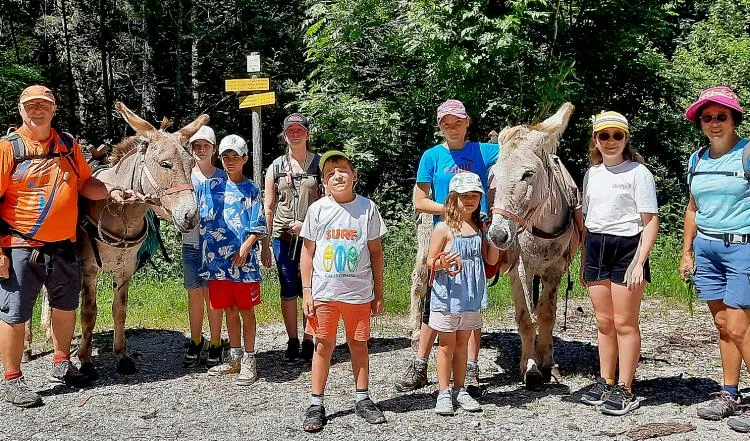 Mardi 9 juillet, sous un soleil radieux, sept enfants de 6 à 12 ans ont marché au pas des ânesses Eglantine et Galinette, dans une bonne ambiance. Ils ont parcouru ainsi environ 9 kms et 350 mètres de dénivelé sur le circuit du col du Plane, depuis le refuge des Garins au Châtelard.
