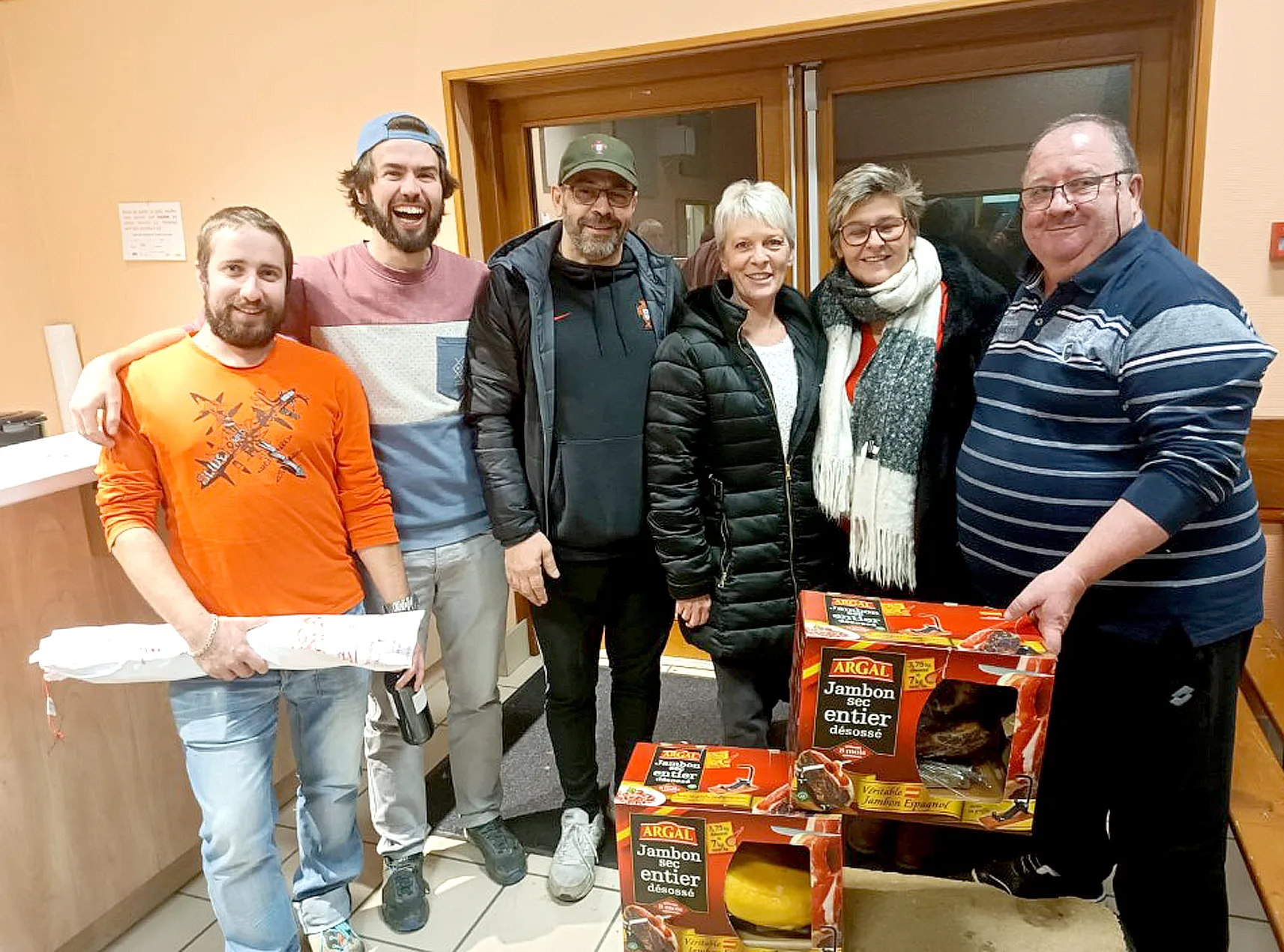Les bénévoles de l'association des Parents d'élèves félicitent les heureux gagnants : Éric et Luis qui remportent 2 jambons et 6 bouteilles de vin, tandis que les seconds, Hélène et Nathalie et 3ème, l'équipe Cemy, gagne rosettes et bouteilles de vin !