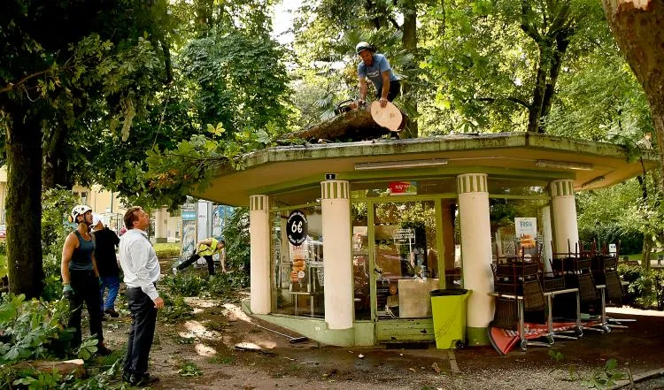 Peu avant minuit dans la nuit de lundi 1er à mardi 2 juillet, une violente tempête s’est abattue sur le bassin aixois. La Cité thermale a été sévèrement touchée par les rafales d’un vent très violent et tourbillonnant, estimées à près de 120 km/h. Arbres déracinés, chaussées et caves inondées, branches cassées, la tempête a marqué son passage. Sur l’esplanade du lac, les premières tentes et barnums déjà installés du festival Musilac ont souffert de ce coup de vent. Peu avant l’embouchure du Sierroz deux catamarans ont été emportés dans la rivière. Sur le parking du Club Nautique Voile d’Aix-les-Bains, plusieurs voiliers sur leur berceau ont été renversés. Dans la nuit et tôt mardi, les équipes techniques de la Ville étaient à pied d’œuvre pour nettoyer les chaussées et dégager les axes urbains. Certaines communes de Grand Lac ont également souffert de coup de vent extrêmement dévastateur.