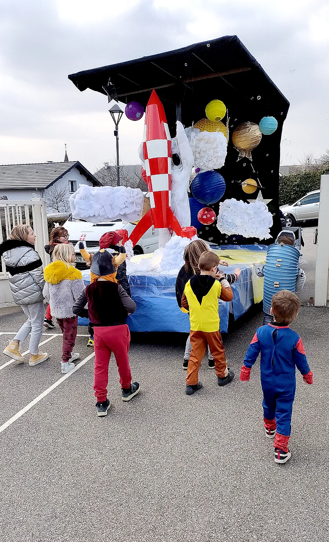 Une soixantaine d’enfants accompagnés de leurs parents étaient attendus. Le défilé est parti à 17h de la cour de l’école pour faire le tour du village. Cette année, grande nouveauté : il y avait un char magnifiquement décoré par les parents de l’APE pour l’occasion. Ils avaient imaginé un somptueux décor de planètes, fusées et étoiles qui a émerveillé les enfants. Tout était très bien organisé pour le plus grand bonheur de tous . Le char était conduit par le président de l’APE Jérôme Bosson, la circulation était gérée par les parents d’élèves répartis sur le trajet du défilé. A l’arrivée, chaque enfant a reçu une compote et un jus de pomme.