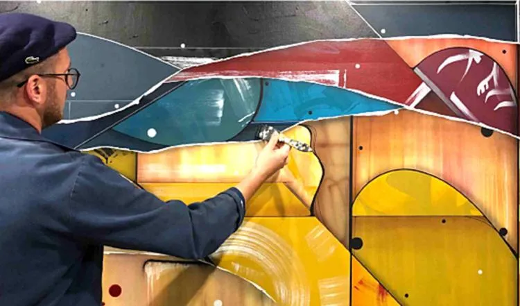 Les déchirures évoquent le temps qui passe, l’histoire qui avance. Il varie ainsi motifs figuratifs, aplats colorés, doux dégradés et ambiance de murs “tagués” comme une sorte de patchwork.