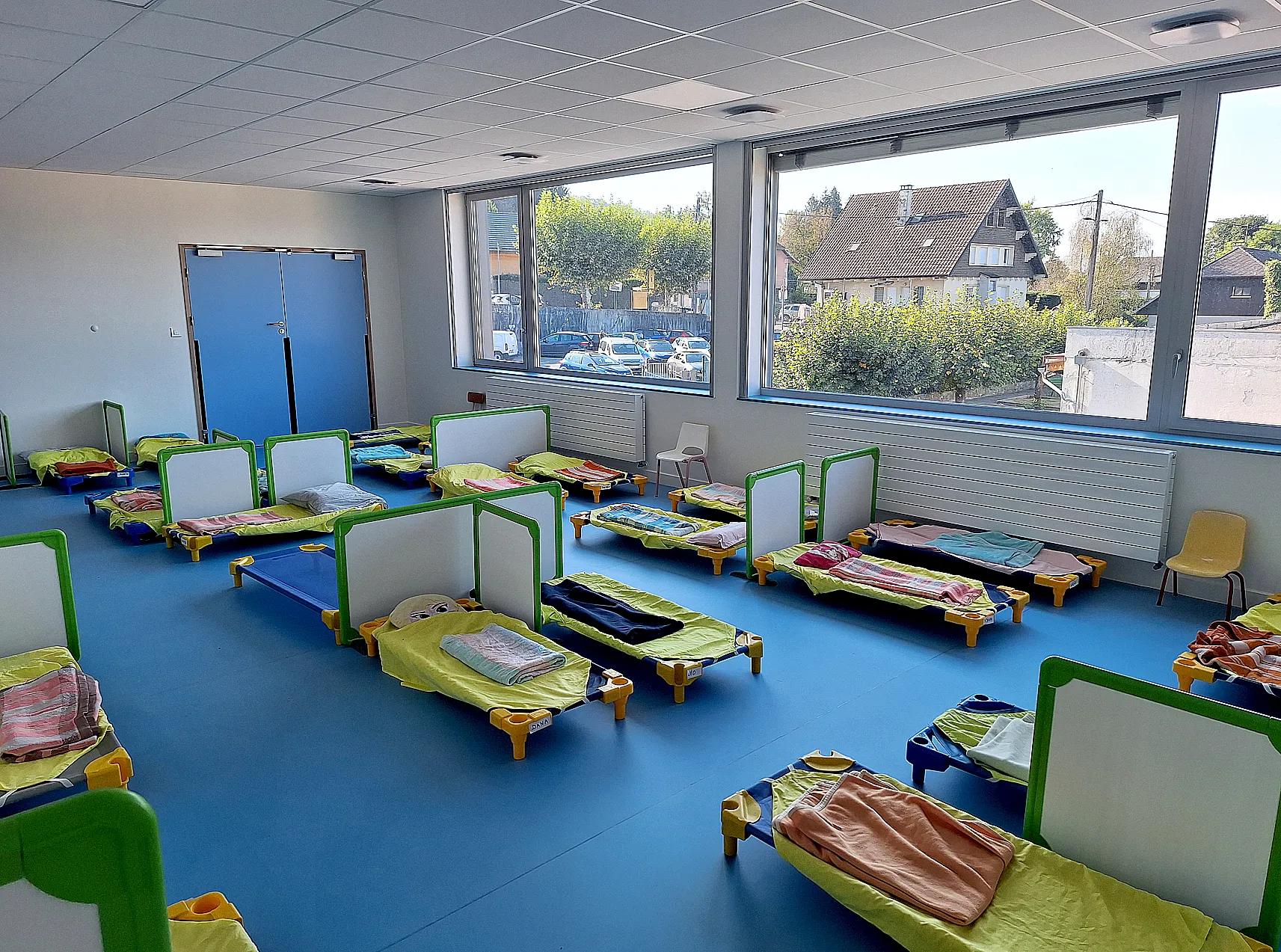 La salle de repos pour les maternelles, colorée et lumineuse.
