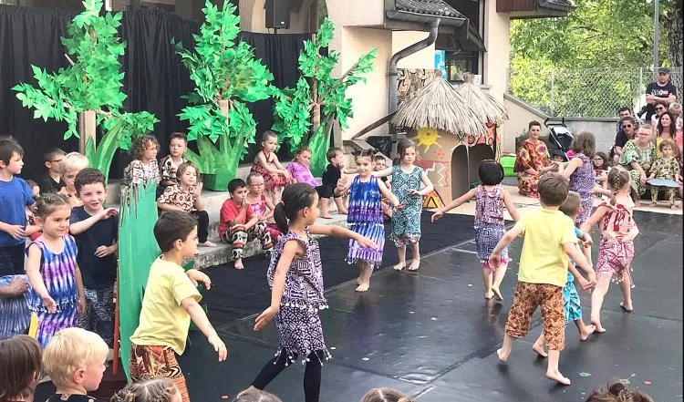 Sur le thème de l’Afrique, une quarantaine d'élèves ont dansé, par petits groupes, au son d'un djembé et d'un bâton de pluie et chanté d'après une histoire racontée par les enseignants : Nicolas, (directeur) et Sophie. Tous étaient habillés de boubous africains avec un décor fait de cartons (cases, arbres, soleil, nuages, éclairs ...).