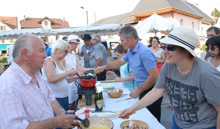Le public écoutait alors quelques mots de bienvenue du maire Alain Bauquis qui rappelait un peu d'histoire locale : St Félix et sa réputée "Fromagerie Picon"... d’où en cette soirée, un clin d’oeil au passé, avec l’inégalable fondue savoyarde touillée par Henri Gonard et de Mauricette Lambert, une fondue, qui, malgré la chaleur, était bien dégustée par les estivants et les autochtones... il est vrai qu’elle était accompagnée d’un petit Seyssel bien frais servi avec le sourire par Nathalie et Martine.