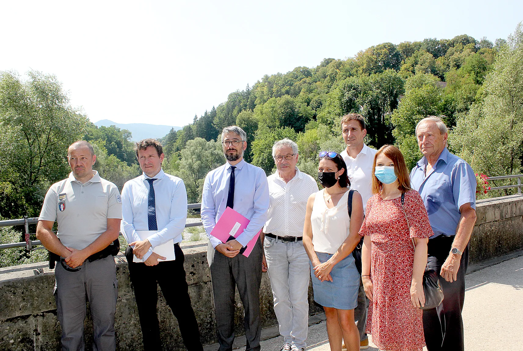 Thomas Fauconnier, secrétaire général de la préfecture, Jean-Claude Martin, maire d'Alby-sur-Chéran, Yohann Tranchant, président du SMIAC et Pierre Bruyère, président du SILA, aux côtés de représentants des services de l'Etat.