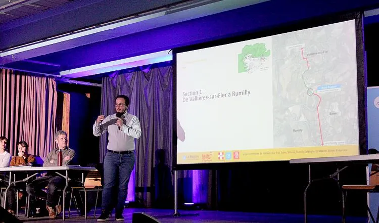 Afin d’informer les habitants et recueillir leurs attentes, la Région AURA a lancé une concertation publique du 11 mars au 7 avril. Dans ce cadre, deux réunions publiques ont été organisées, côté Savoie à la salle plurivalente d’Albens le 18 mars, et côté Haute-Savoie à la salle des fêtes de Rumilly le 28 mars. La concertation préalable permet d’associer toutes les personnes concernées par le projet (riverains, associations, cyclistes, acteurs économiques, etc.) à son élaboration en tenant compte de tous les aspects (son opportunité, son tracé, ses variantes, les équipements souhaités, la cohabitation entre les modes, les vocations attendues pour les haltes...). Ces réunions publiques ont consisté en des ateliers « groupes de travail » pour approfondir les thématiques des haltes, de la cohabitation des usages et des variantes du tracé. Les représentants du maître d’ouvrage passaient de table en table pour répondre aux questions des participants et noter leurs remarques. A Rumilly, 76 personnes étaient réparties en 11 groupes de travail, dont de nombreux cyclistes du quotidien et agriculteurs (57 personnes ont participé à la réunion publique d’Entrelacs dont le compte-rendu a été finalisé. Celui de Rumilly devrait être dévoilé prochainement).