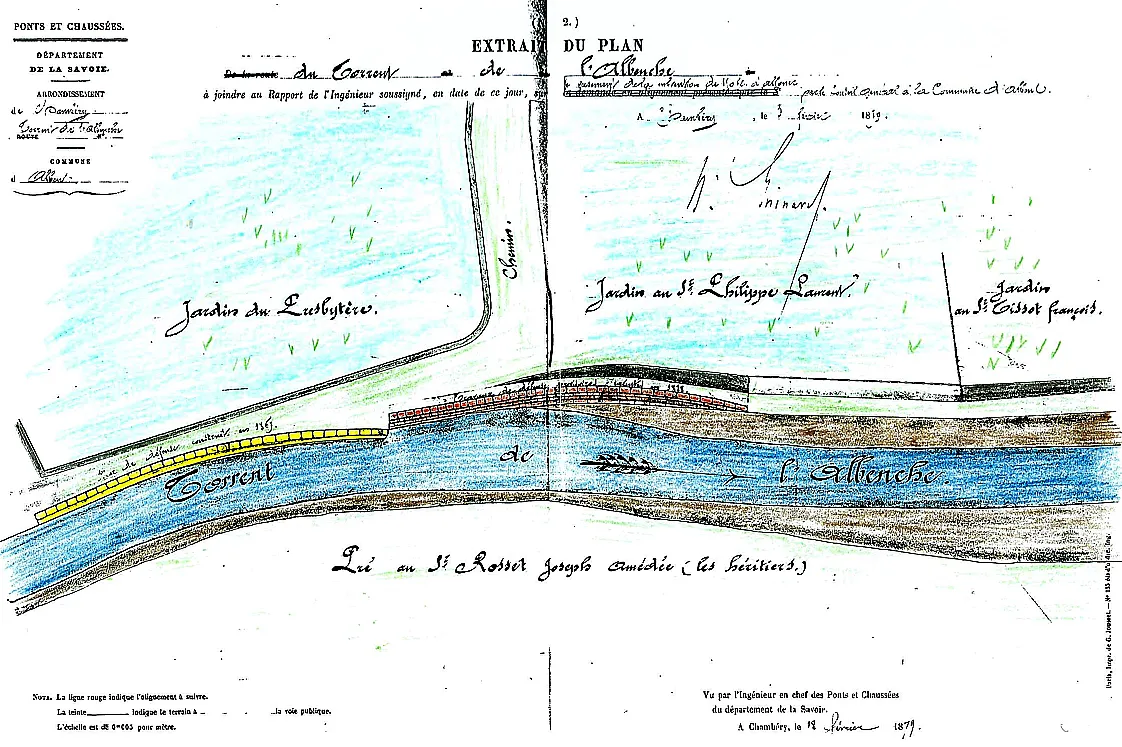 Une autre solution est envisagée par le gouvernement Sarde au début du XIXème siècle, construire une solide digue pour contenir les flots de l’Albenche. Ce sont principalement des ouvrages en terre qui vont être édifiés régulièrement et tout aussi régulièrement mis à mal par le cours d’eau. On possède un plan produit en 1879 par l’administration française des Ponts et Chaussées. A l’observation, on constate que les protections ne constituent pas un ensemble homogène et conservent les mêmes faiblesses que les réalisations de l’époque Sarde. Il faudra attendre les années 1910 pour qu’une digue de pierre solidement construite mettent fin aux irruptions de l’Albenche au coeur du village.