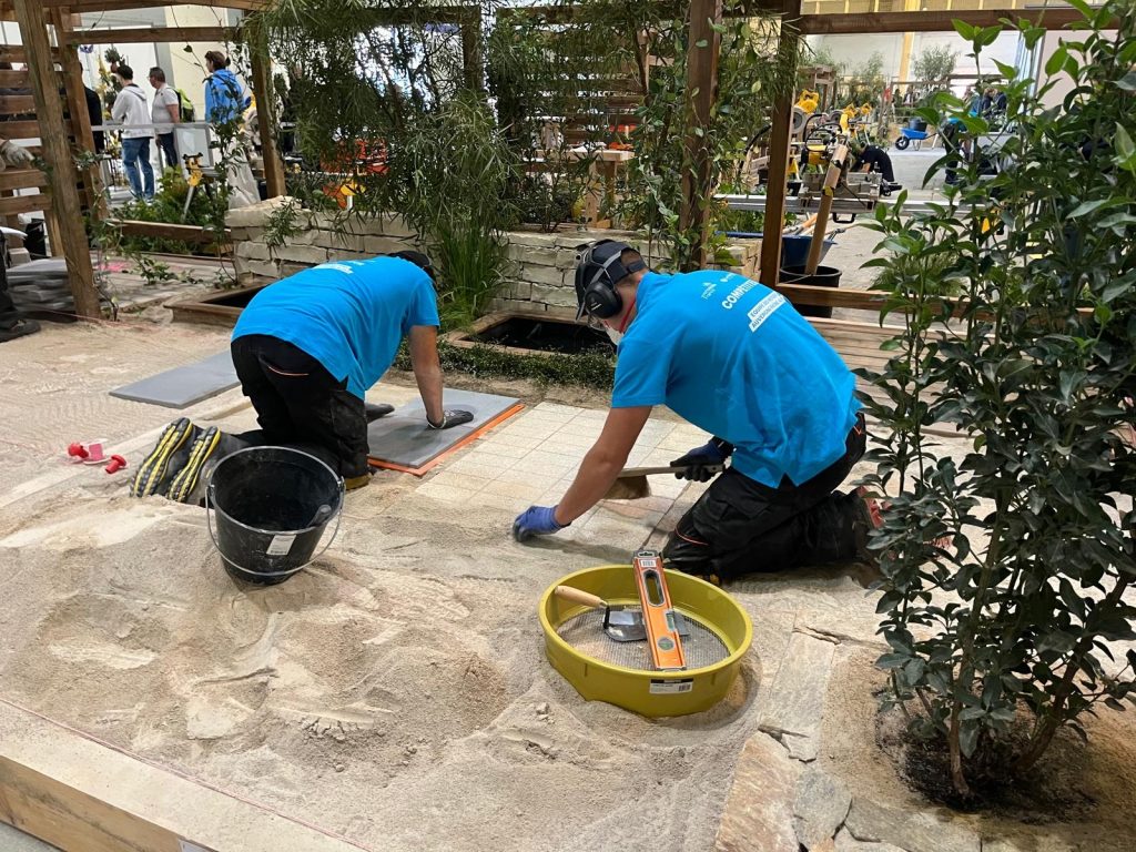Durant deux jours et demi d’épreuves, le binôme a dû concevoir un aménagement paysager complet de 3,5 m sur 4 m : pavage, dallage, muret, jardinière en pierres sèches, bassin, structures bois, plantations et pergola.